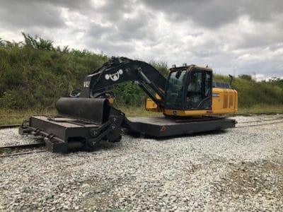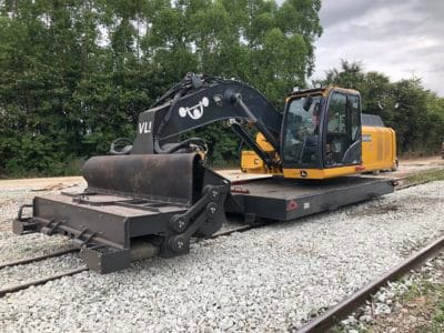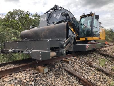 A implementação é caracterizada pela substituição do conjunto rodante original da escavadeira hidráulica John Derre 210G (esteiras de tração) por um chassi adaptado para a locomoção sobre trilhos. O chassi, além da função estrutural, tem a função de abrigo e suporte para os rodeiros ferroviários, os atuadores dos freios e os componentes do sistema hidráulico (condutos, válvulas, motores e cilindros). Ainda na estrutura do chassi, é observada a presença dos engates ferroviários, que permitirão ao equipamento seu acoplamento em composições, tanto com a função de rebocador, como, também, sendo rebocado por outro(s) equipamento(s) motriz(es).